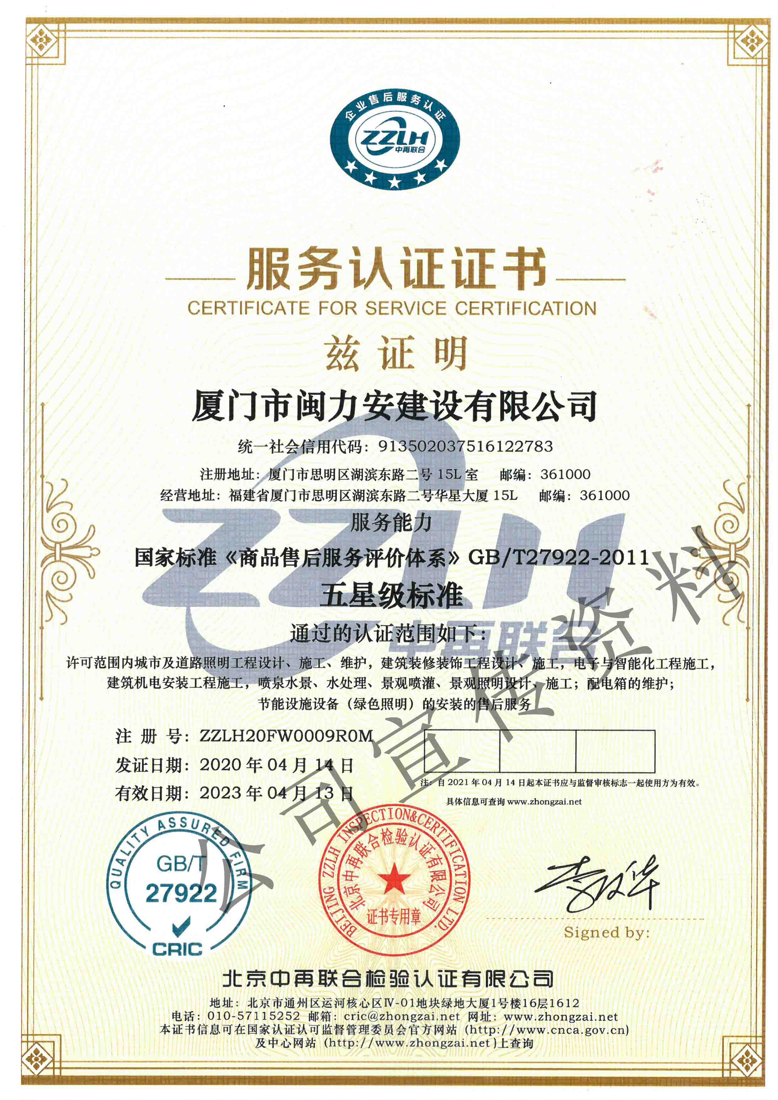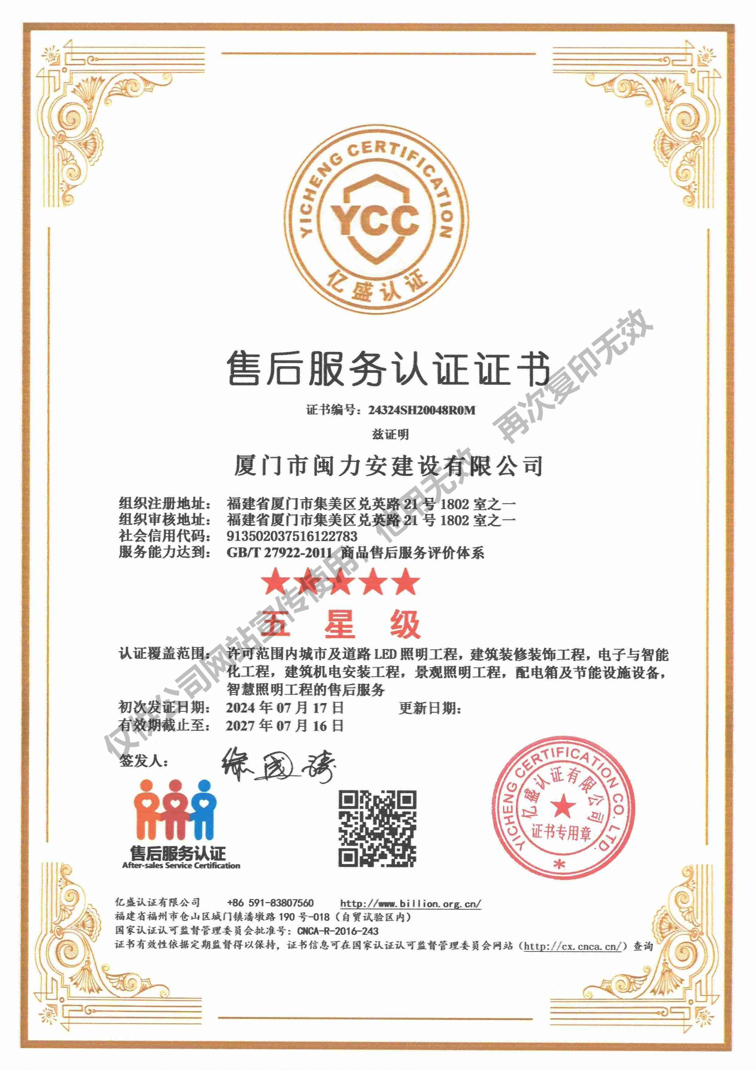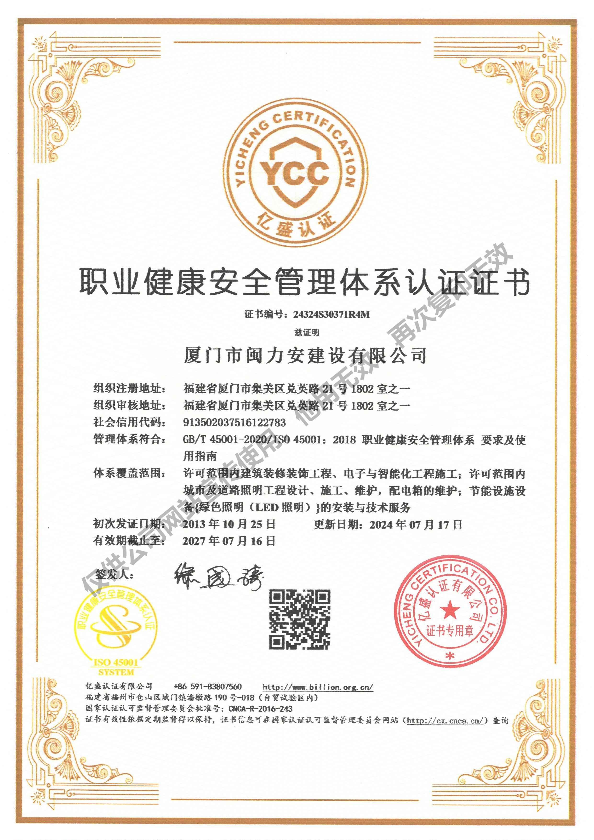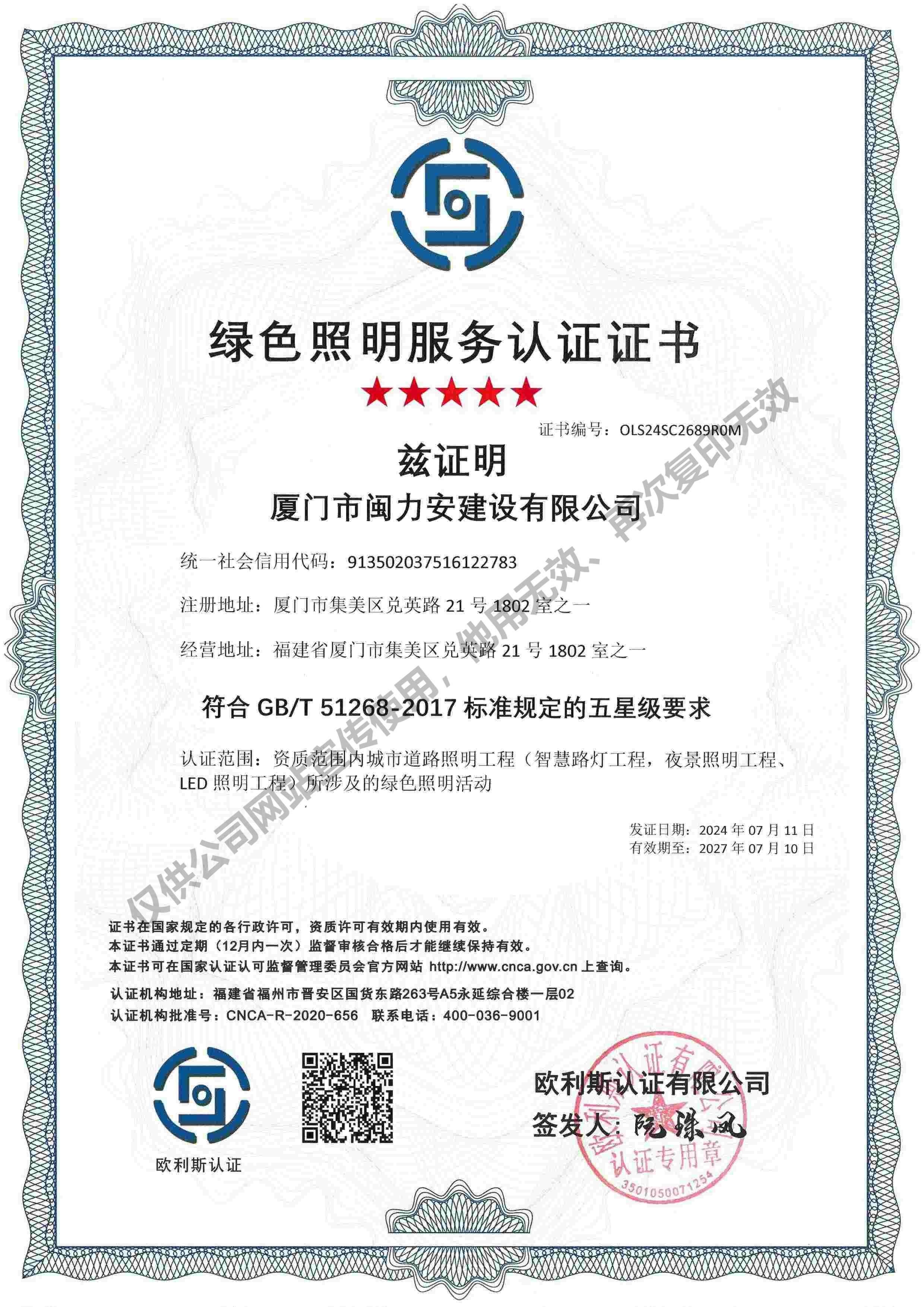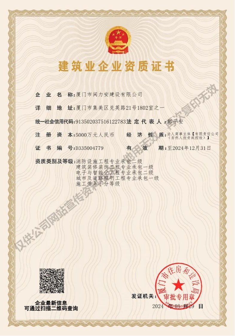 廈門市閩力安建設有限公司成立于2003年,公司取得市政公用工程施工總承包貳級、建筑裝修裝飾工程專業(yè)承包壹級、城市及道路照明工程專業(yè)承包壹級、電子與智能化工程專業(yè)承包貳級、消防設施工程專業(yè)承包貳級、電力工程施工總承包叁級、建筑機電安裝工程專業(yè)承包叁級、輸變電工程專業(yè)承包叁級、環(huán)保工程專業(yè)承包叁級、照明工程設計專項甲級、建筑裝飾工程設計乙級、施工勞務等資質的綜合型企業(yè),公司于2013年通過了ISO9001質量體系認證,ISO14001環(huán)境管理體系認證,OHSAS18001職業(yè)健康安全管理體系認證。